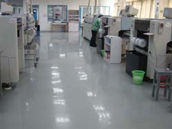 ⑦防靜電面漆:防靜電面漆滾涂二道,其體積/表面電阻平均系數值1X10^6~1X10^9Ω,完工后整體地面光亮潔凈,顏色均一,無空鼓;