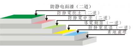 ②素地處理: 依素地狀況做好打磨、修補、除塵; ③防靜電底漆:采用滲透性及附著力特強防靜電環(huán)氧底漆滾涂一道,增強表面附著
