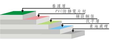⑤貼PVC防靜電片材:采用導(dǎo)電膠粘劑刷涂在PVC防靜電片材上,遵守晾置時(shí)間,進(jìn)行加壓膠接,然后處理接縫處,用膠焊機(jī)把防靜電焊條接好,并處理;